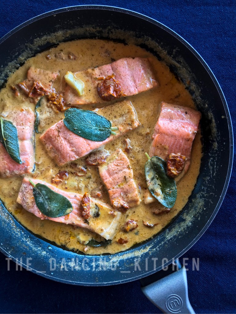 Seared trout fillets in butter, sautéed some crushed garlic and chopped sun dried tomatoes that I bought couple of months ago to make sun dried tomato pesto and never used, Used heavy cream and broth for thick sauce, some capers and fresh sage leaves, because my sage plant from balcony was waving me and saying “hello…. You can use me too …..”