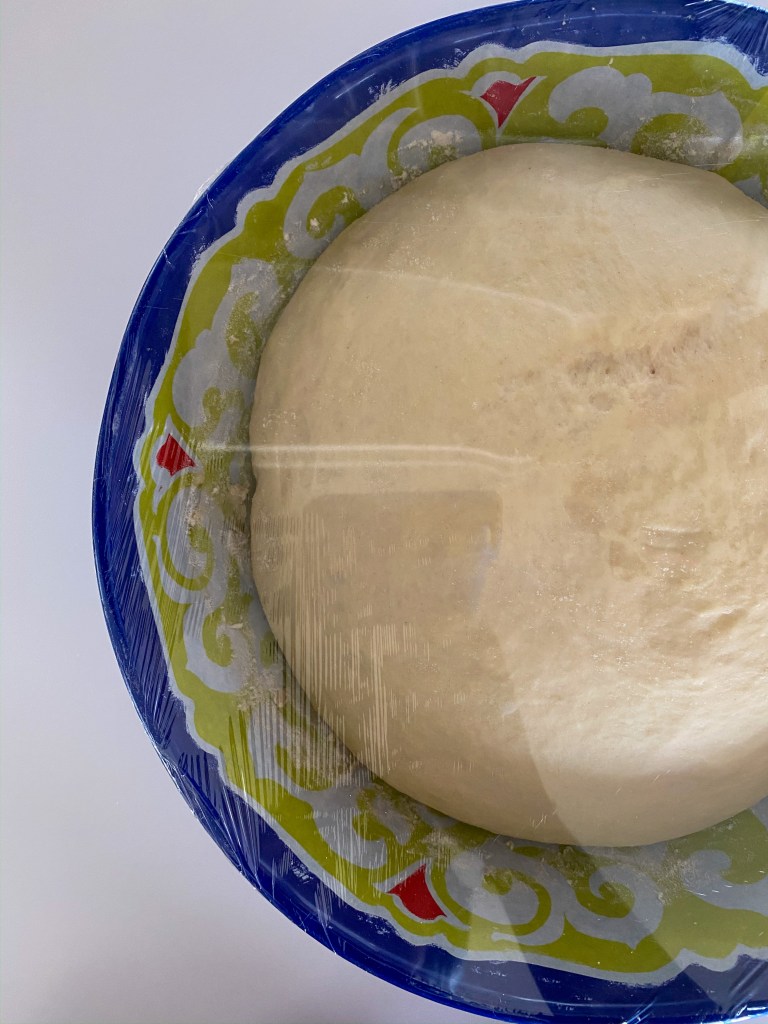 8.place the dough in a oil/butter greased bowl add cover with a cling wrap and leave it in the warm place to double in size about 2h.