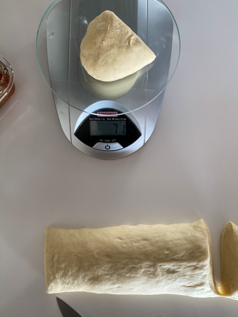 10.shape the dough into a baguette/log. Divide into some equal parts. Mine was between 65-70g.