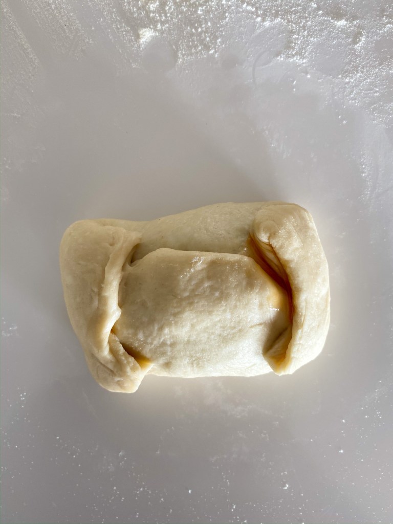 12.bring both up and down sides inwards, later bring the other two sides and gently press it to the dough to get stick. (See the images)