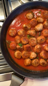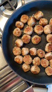 4.heat a large pan with 2tbs olive oil and place all the meatballs and sear all the sides until brown in colour. This may tase 10-15 minutes in low heat and at this point your meatballs are halfway cooked.