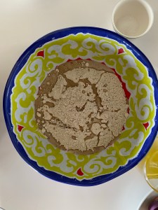3.then add yeast to the flour along with 1tbs olive oil and mix using wooden stick/chopstick/fork.