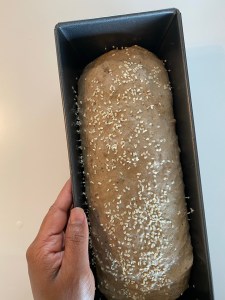8.place the loaf gently in the pan. Lightly brush the top with 1tbs water and sprinkle the handful of dry pumpkin/sunflower/sesame/chia or any other seeds you prefer. Gently press each seed to the dough, get attached with it and cover with a cling wrap. Leave it to rest more 50-60minutes.