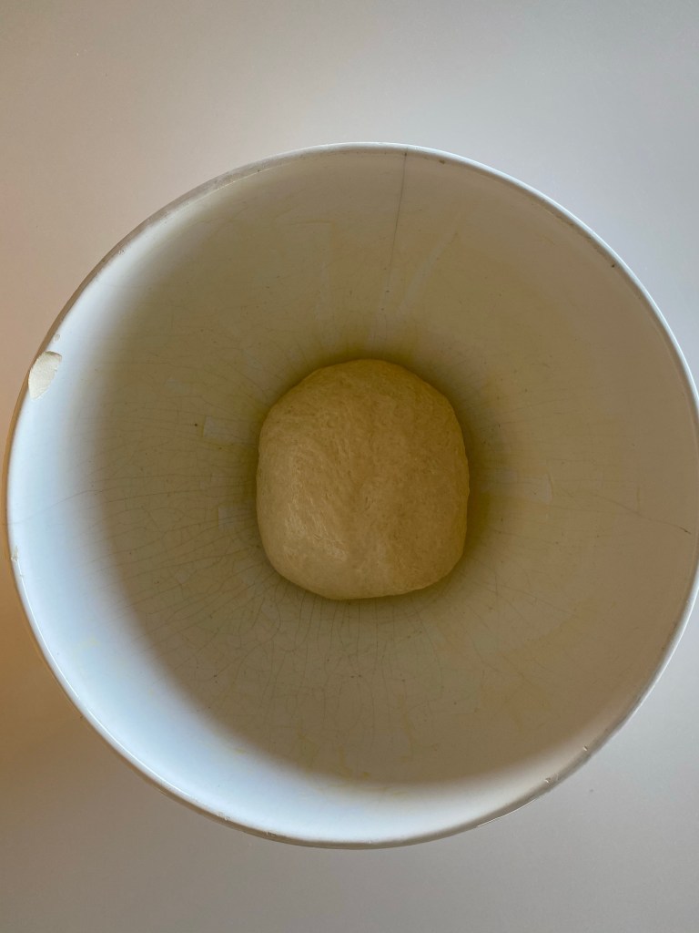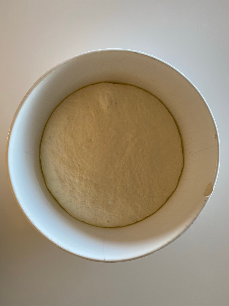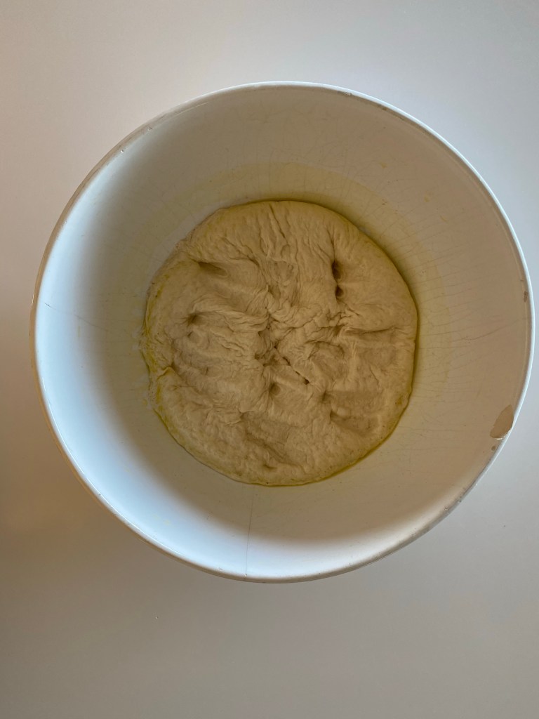 6.lightly grease a large bowl with 1/4tsp olive oil and place the dough in. Cover with a cling wrap or damp cloth and leave it to rise in cool dry place about 2h.