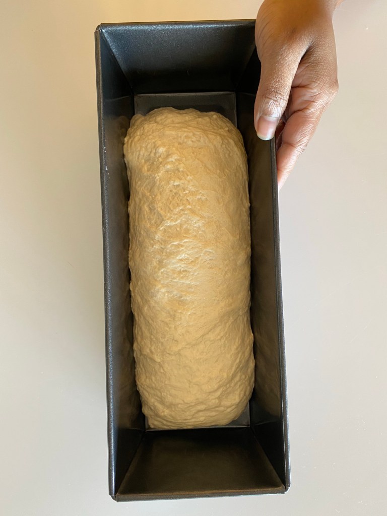 9.prepare your loaf pan with parchment paper or lightly grease with olive oil. Place the loaf in the pan and leave it to proof more an hour.