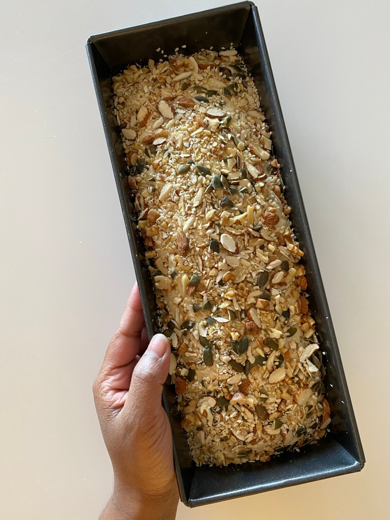 Here I used the nuts I had in my pantry but you can add anything you prefer. Just one also looks good and the simple loaf without nuts also works well.