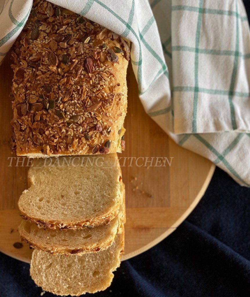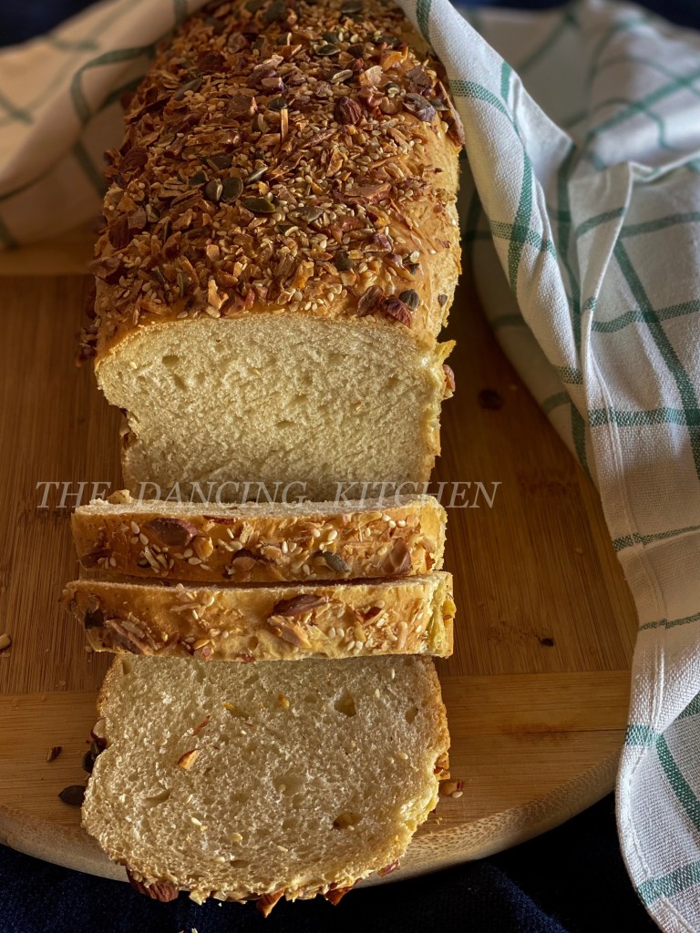 Just a classic white bread loaf from 00 flour and fancy toppings. I always love to create something new in my every work. I love to see some simple fancy look on my works. it makes me feel better, comfortable. I started to think, pay attention what I cook from the moment I enter to the kitchen and plate it. While I was kneading this white bread I didn’t wanted to see just a classic white bread loaf at the end. I was thinking, thinking and thinking of something new. Then I thought I should do the top like this. I got some sesame seeds, pumpkin seeds, walnuts and almond seeds in my pantry. Chopped chopped and chopped all absolutely except sesame seeds and sprinkled on top. Was beautiful to see even. I always love to see my foods beautiful. Even though I cook it just for we two I wanted it to look, taste like the best. Someone has told (I cannot remember who was) “the food we make, we order must looks beautiful as it’s taste. Before we taste it from our mouth/tongue we eat it from our eyes….” that’s true right…?