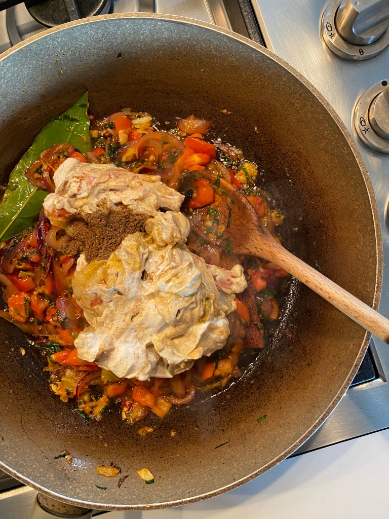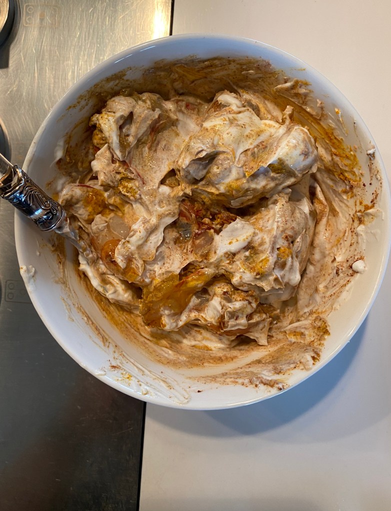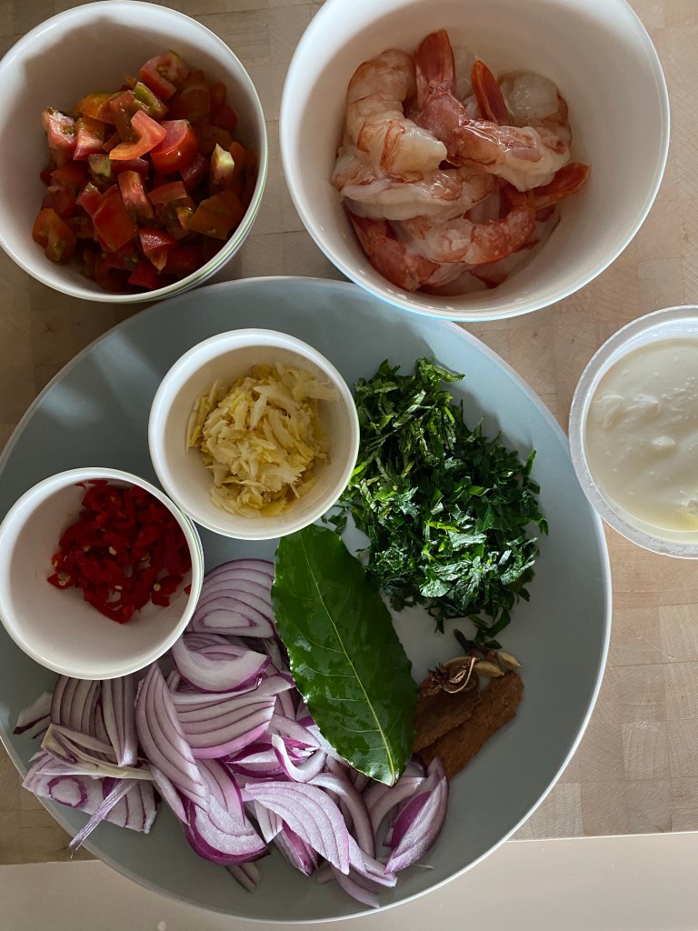 4.marinate the prawns with 1tbsp chilli powder, 1/2tsp of each coriander powder, cumin powder and 1/4tsp turmeric powder and 150g Greek yoghurt about 10-15 minutes.