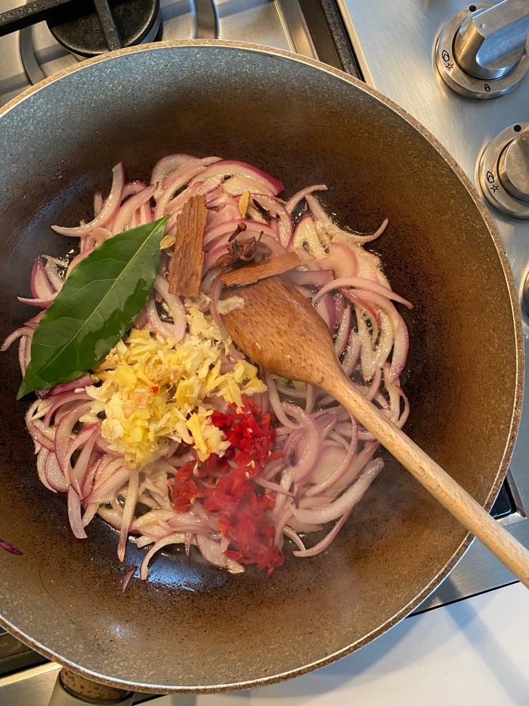 6.add finely sliced 1 large onion and cook until translucent. Then add cinnamon piece, 1 Star anise, 2 cardamom, 2 cloves, 1 bay leaf, 2 chopped chilies, grated/mashed 2 garlic cloves and 2 inch size ginger. Sauté everything about 2-3 minutes in medium heat. Let the aromatic flavour release.