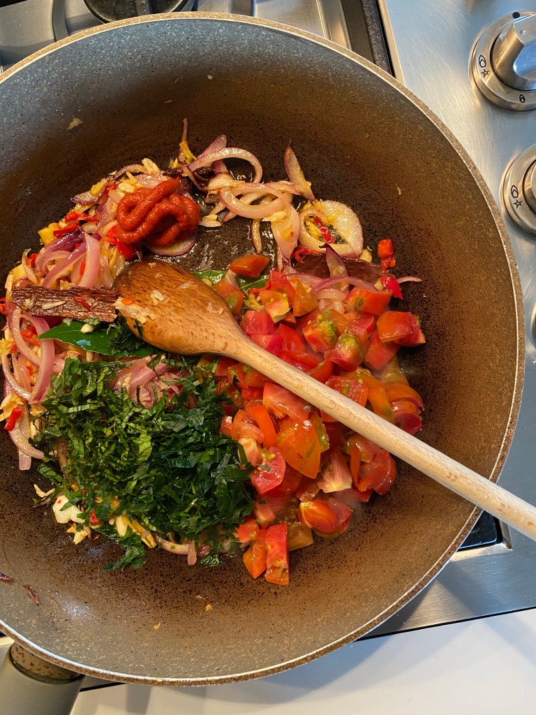7.add diced 1 large tomato, 1tbsp tomato concentrate, salt, handful of chopped parsley/coriander and mint leaves and 1/2tsp garam masala powder and sauté until soggy in medium heat about 3-4 minutes.