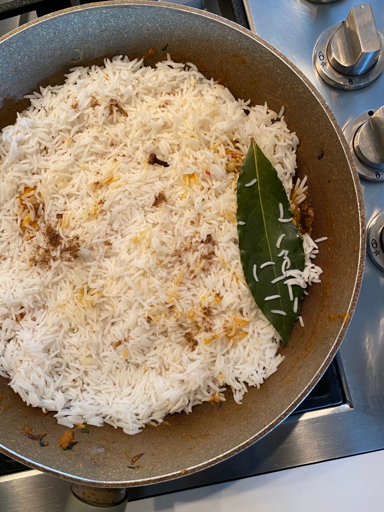 3.bring a pot of water to boil with 1 bay leaf, 1 clove, cinnamon piece, 1 star anise and 2 cardamom pods. Once the water started to boil drain the rice and add it to the pot. Cook 5 minutes, drain and leave it in the colander to leave the excess water.