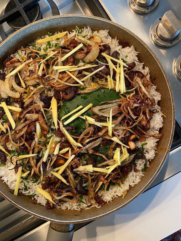 11.at last sprinkle handful of chopped parsley and mint leaves, fried cashews and onion, 50g raisins and melted 2tbs ghee, 1g saffron mixed with 3-4tbs hot milk over the rice and cover with a lid.