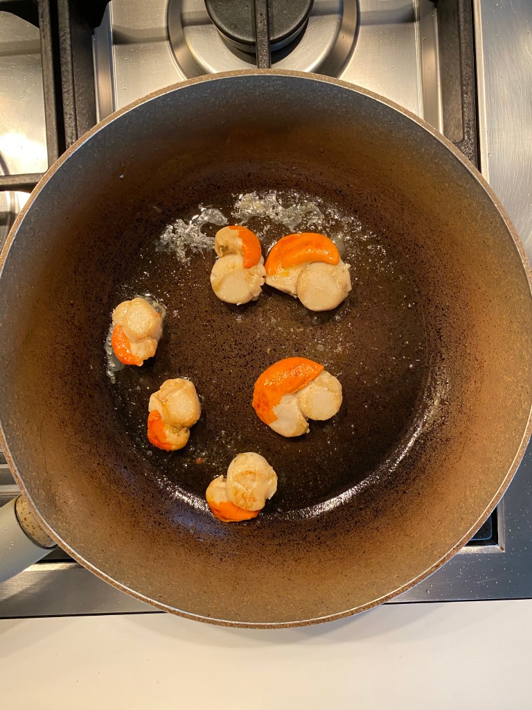 2.heat a pan on medium heat and add 2tbs olive oil. Once the oil is hot, place all the scallops and cook each side about 2 minutes and take away from the pan. Leave on a plate.