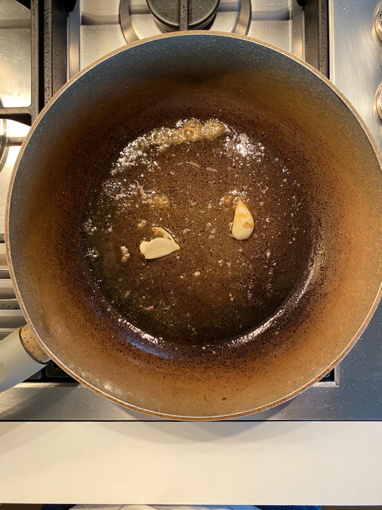 3.into the same pan add crushed 1 garlic clove and fry.