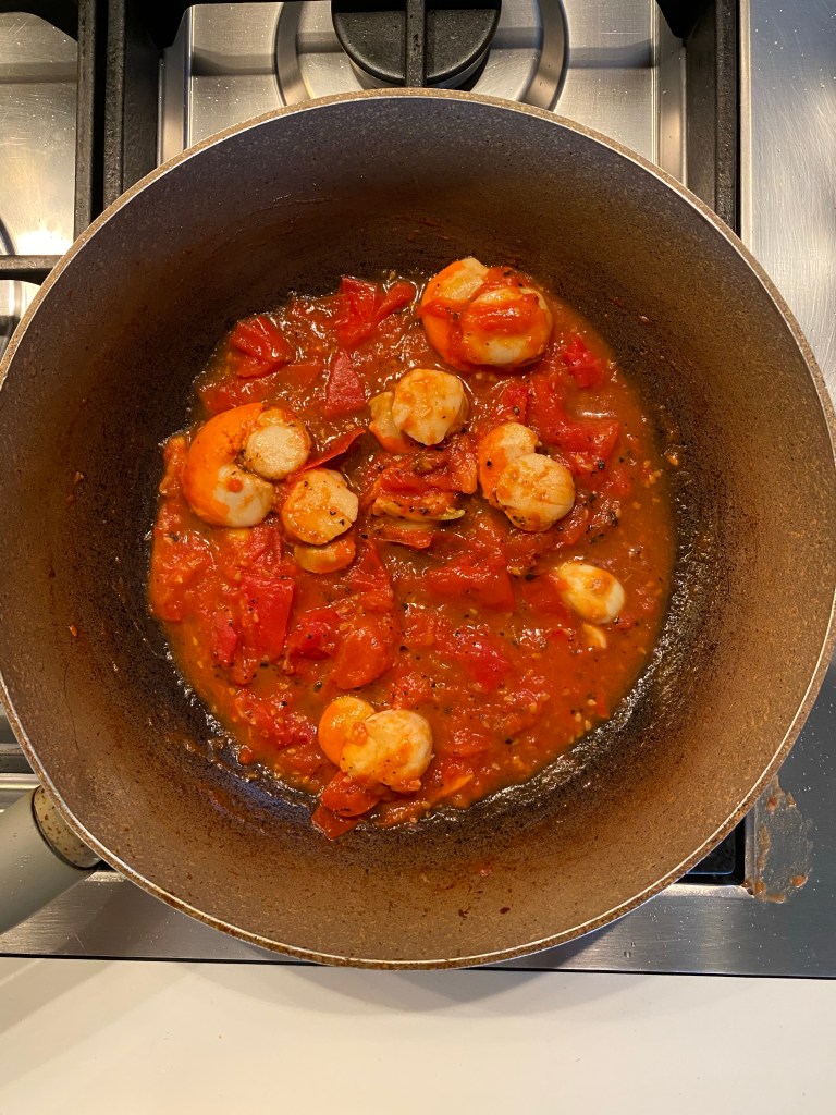 5.place all the pre cooked scallops and cook with tomatoes about 3-4 minutes.