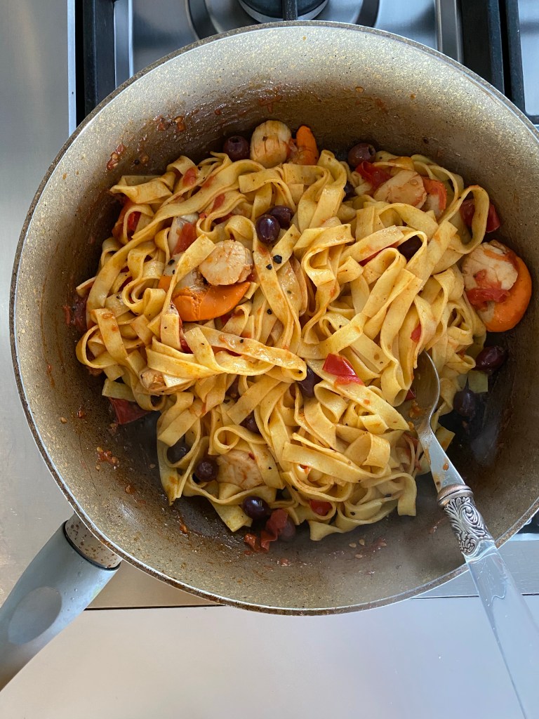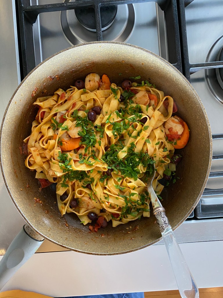 7.add handful of taggiasca olive and handful of freshly chopped parsley to the pan. Mix all well with pasta and sauce.