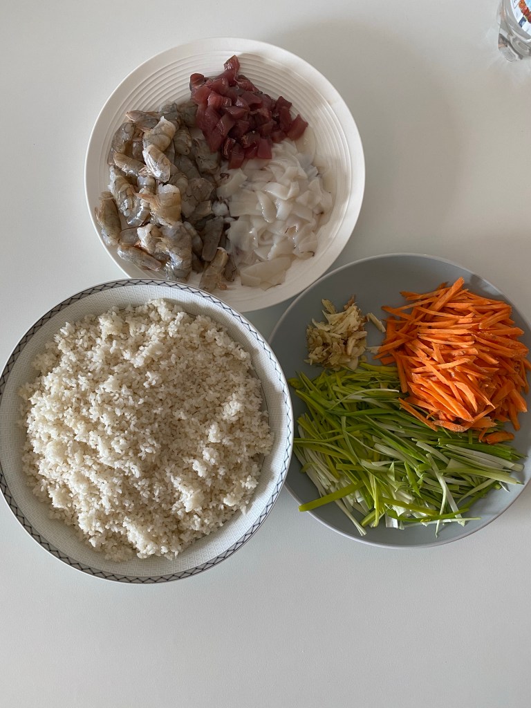 8.fry both prawns and cuttlefish until lightly brown add leave aside with tuna.