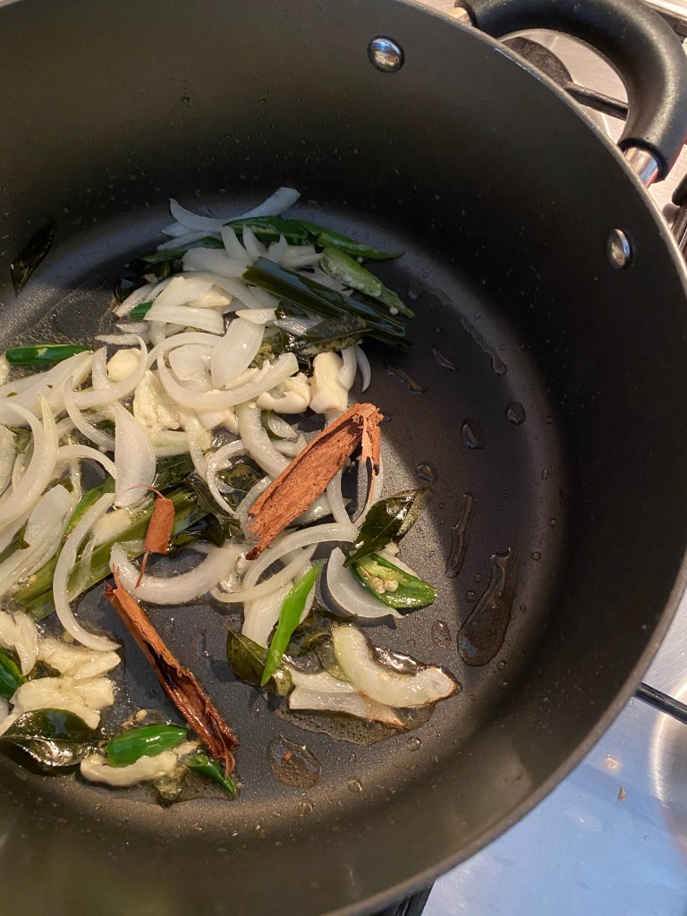 3.heat a large pot with 2-3tbs of cooking oil, once the oil is well heated add finely sliced 1/2 medium onion, 3-4 crushed garlic cloves, 4 sliced green chilies, handful of curry leaves, small pandan leaf and small cinnamon stick.
