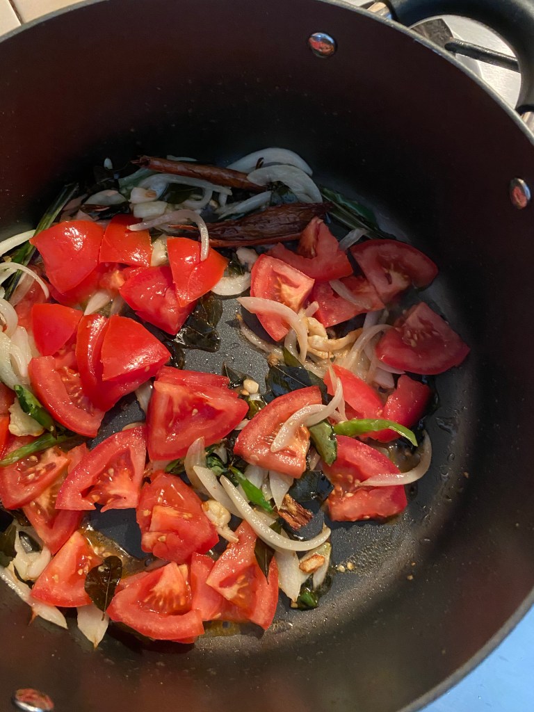 5.add sliced 2 medium tomatoes and cook with aromas until soft and juicy.