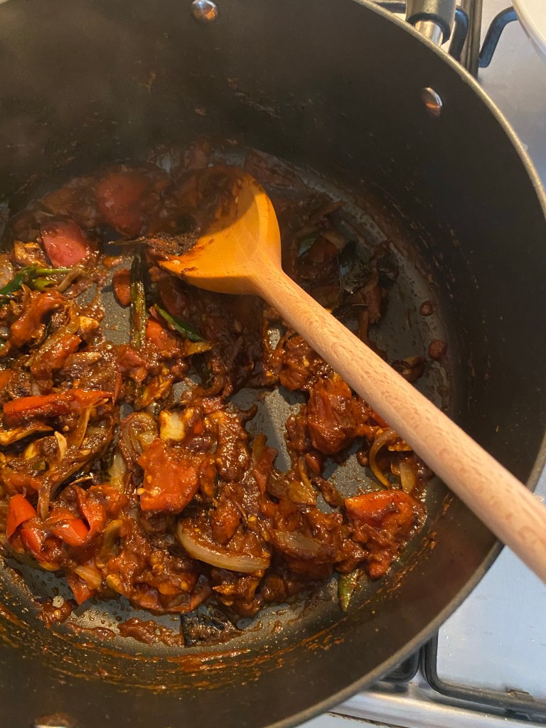 6.then add 4,1/2tbsp of chilli powder and cook with aromas for about a minute.