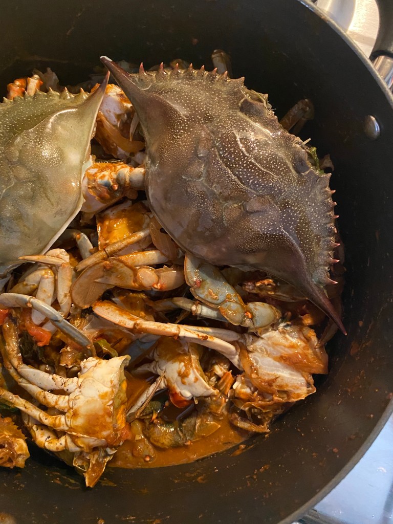 Break out two claws then mash slightly using a knife or pestle which helps to absorb the curry and spices to the meat while cooking.