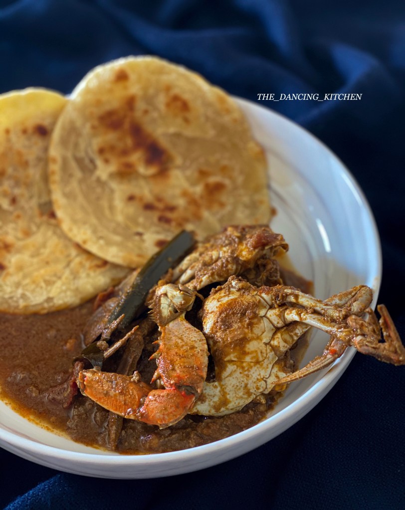 This time we had some homemade Partha with this spicy crab curry. But usually when we in Sri Lanka, we always used to eat crab curry with white rice and cucumber salad or gotukola sambol. Because crab is a high heat meat and to balance it my mother always make some salad to cool the meat.