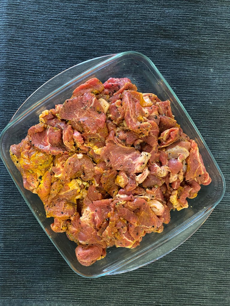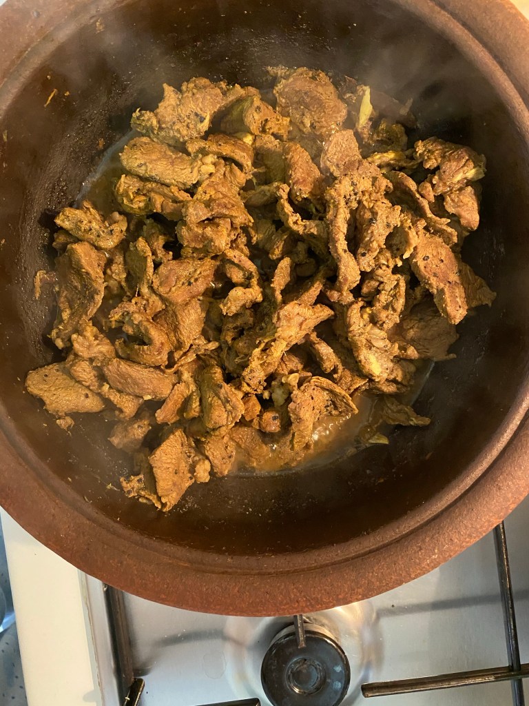 1.it was 1200g beef. Cut into thin slices. Marinate overnight if possible or at least two hours with 1tsp turmeric powder, 1,1/2tbs vinegar, 5tsp freshly cracked black pepper and salt on your taste. Cover with a cling wrap and leave it to marinate.