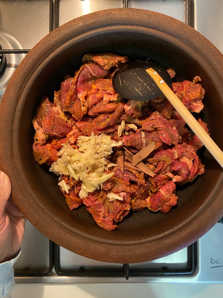 2.place the marinated beef in a large pot along with 20-30ml water, crushed 3-4 garlic cloves and 1 inch size ginger, 2 small pieces of cinnamon, 3-4 cardamom pods and fire on.