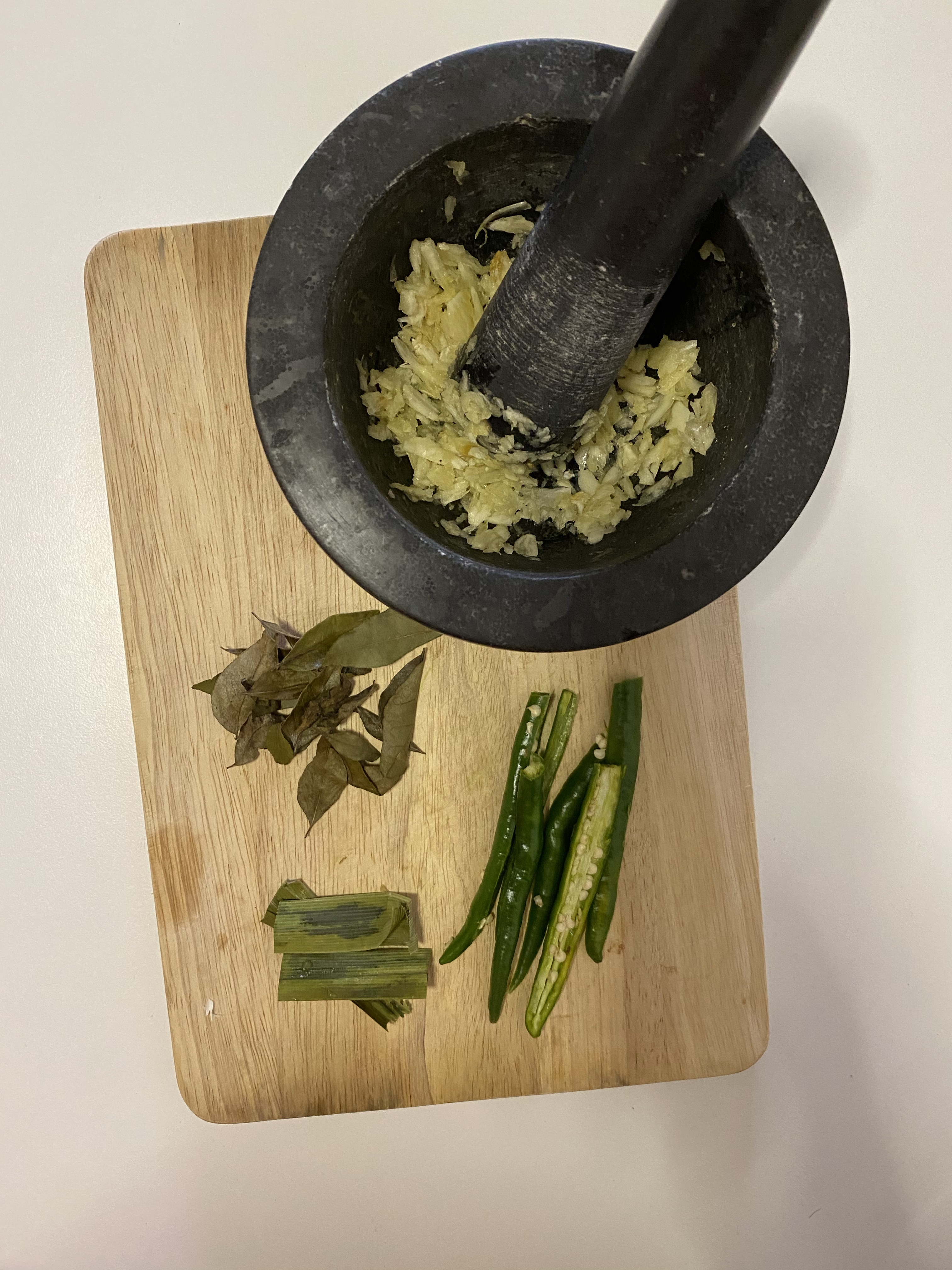 7.once the curry starts to bubble add 3 split green chilies, few curry leaves and piece of pandan leaf. Shake the pot and let it simmer until gravy is thick and reduce.