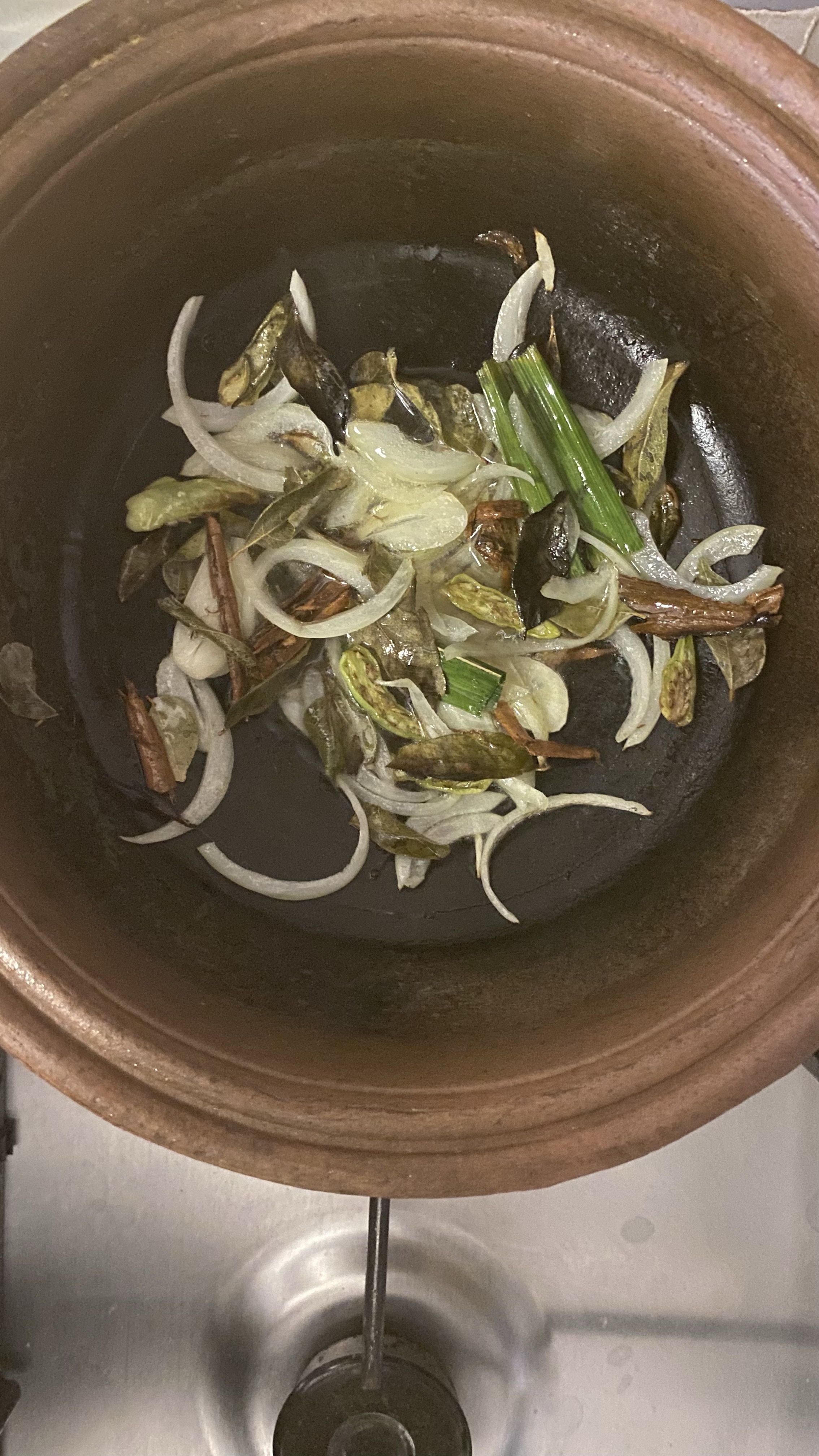 3.heat the pot with 2tbs oil and add finely sliced 1/2 small onion, 2 green split green chilies, 1 sliced garlic clove, few curry leaves, piece of pandan leaf, piece of cinnamon stick.