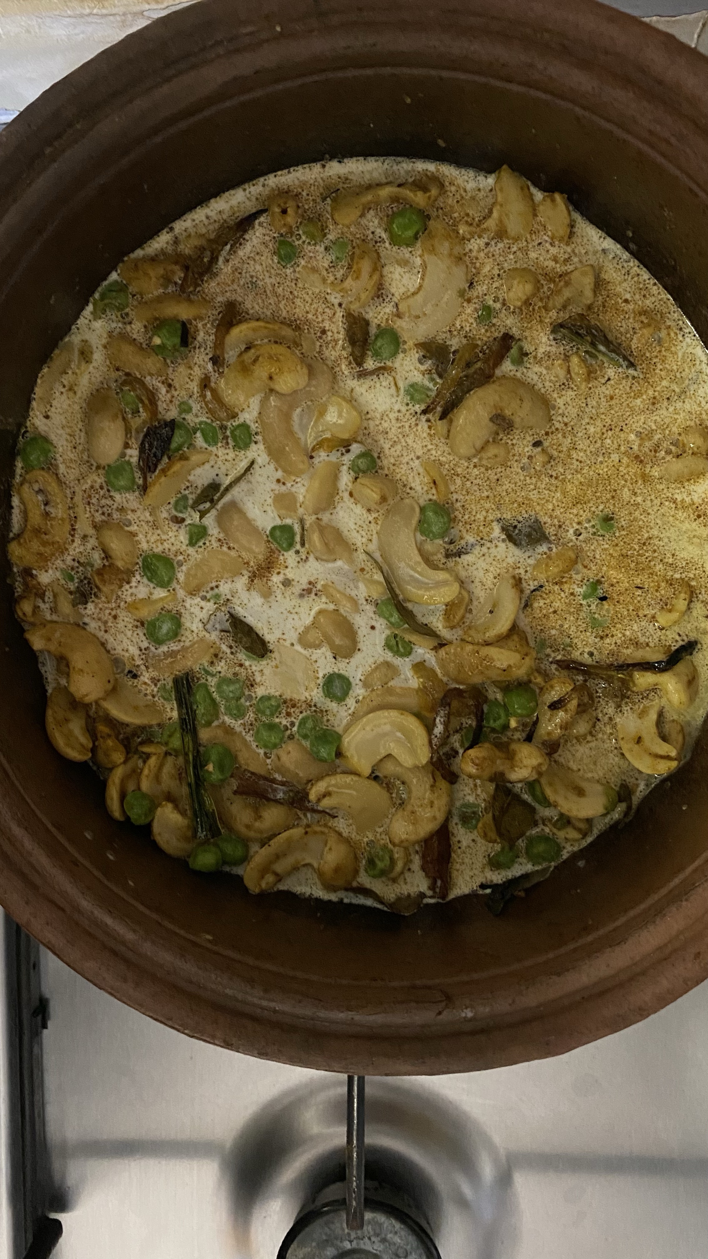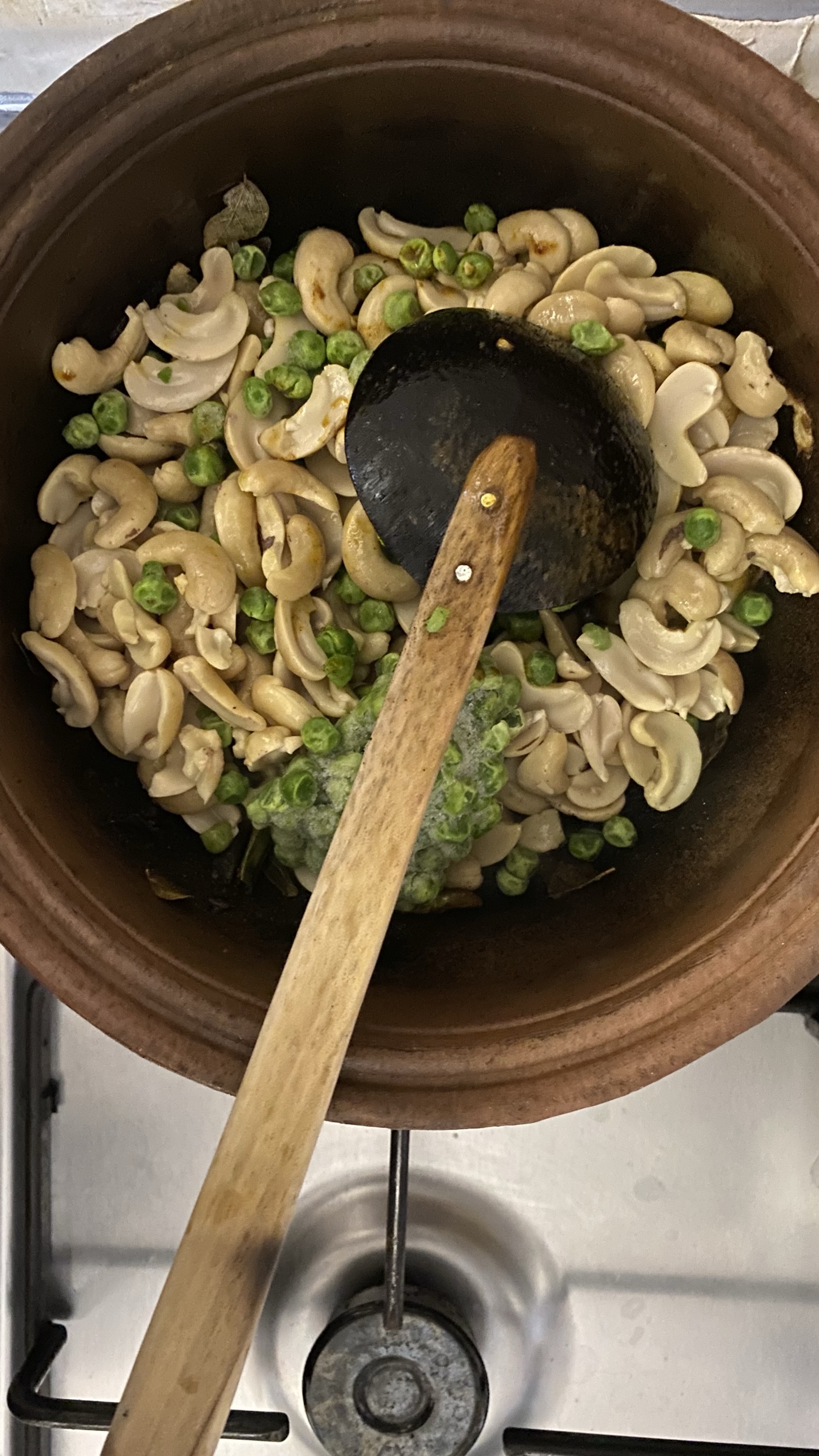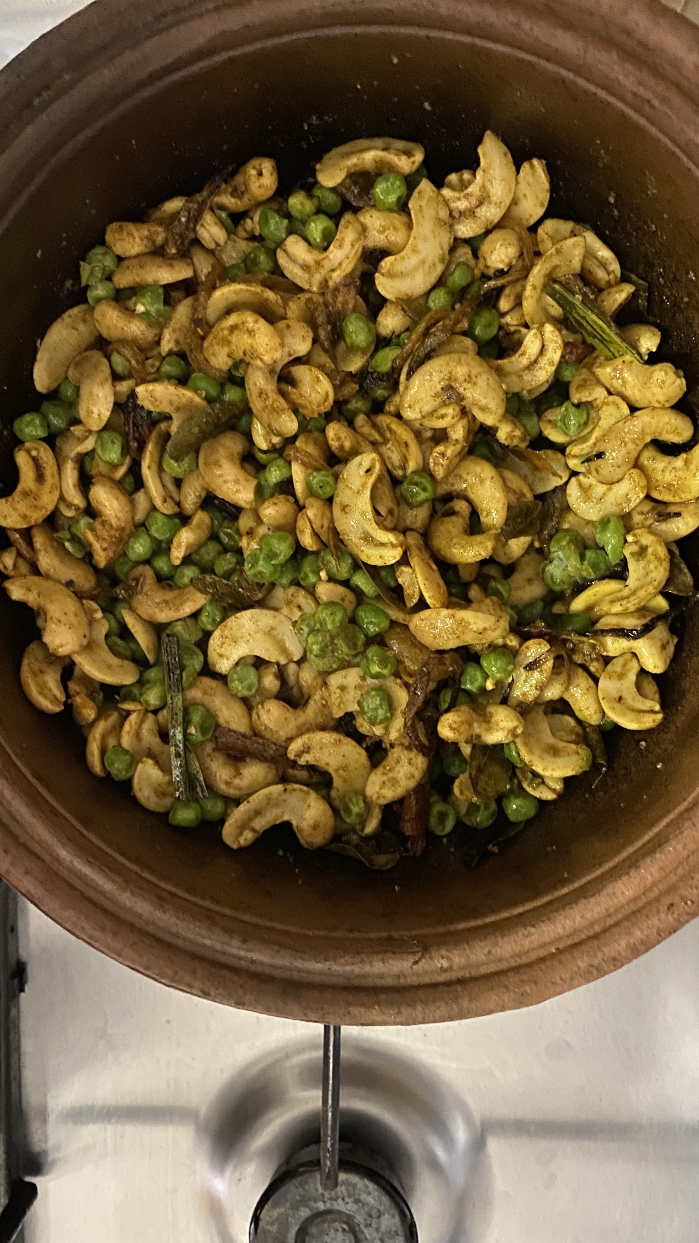 6.add the boiled cashews along with frozen green peas and mix well with aromas and spices.