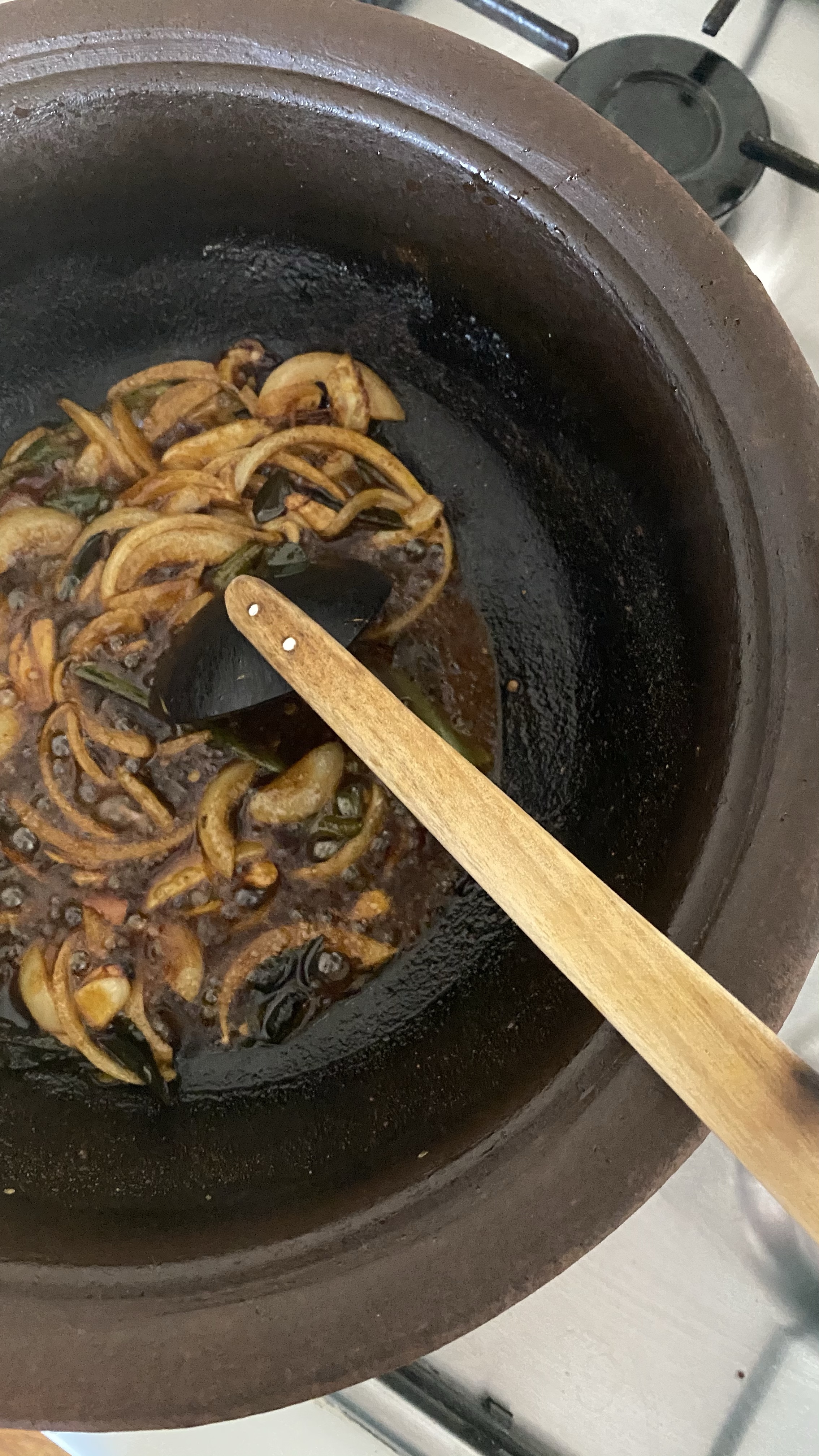 3.meantime heat a clay pot/saucepan with 3tbs oil. Once the oil is heated add finely sliced 1/2 medium onion, sliced 2 garlic cloves, split 2 green chilies, few curry leaves and piece of pandan leaf along with piece of cinnamon stick.