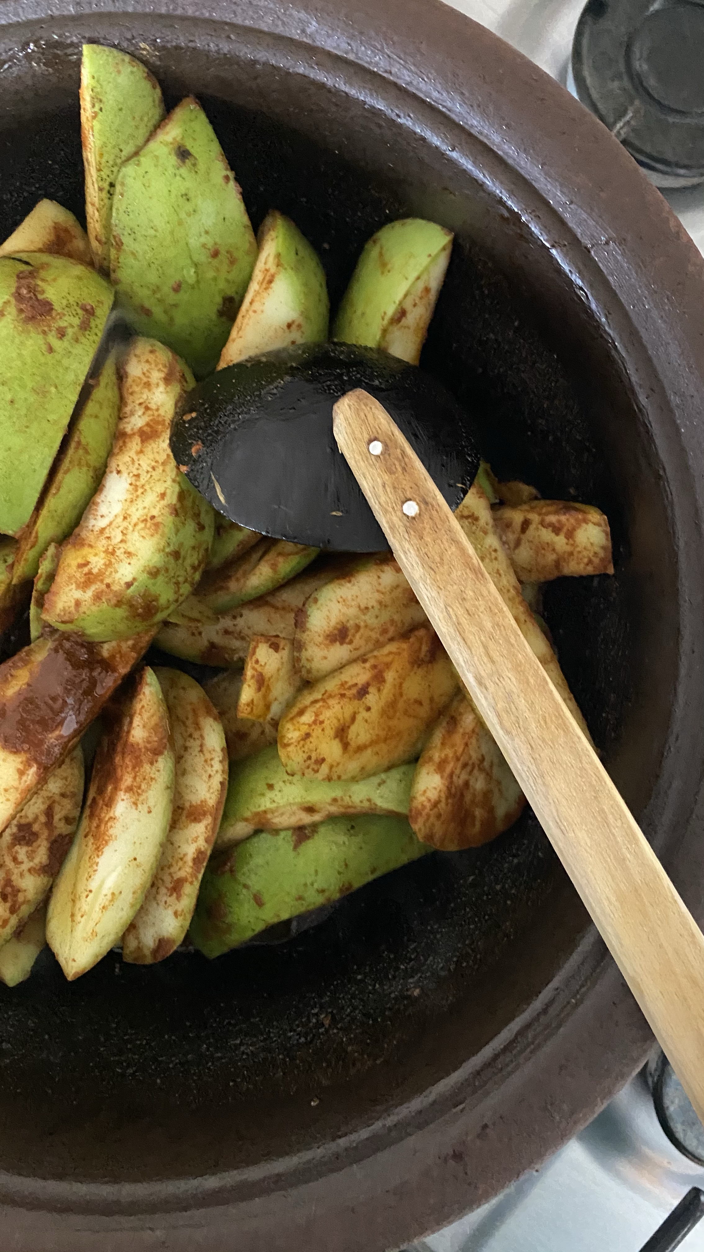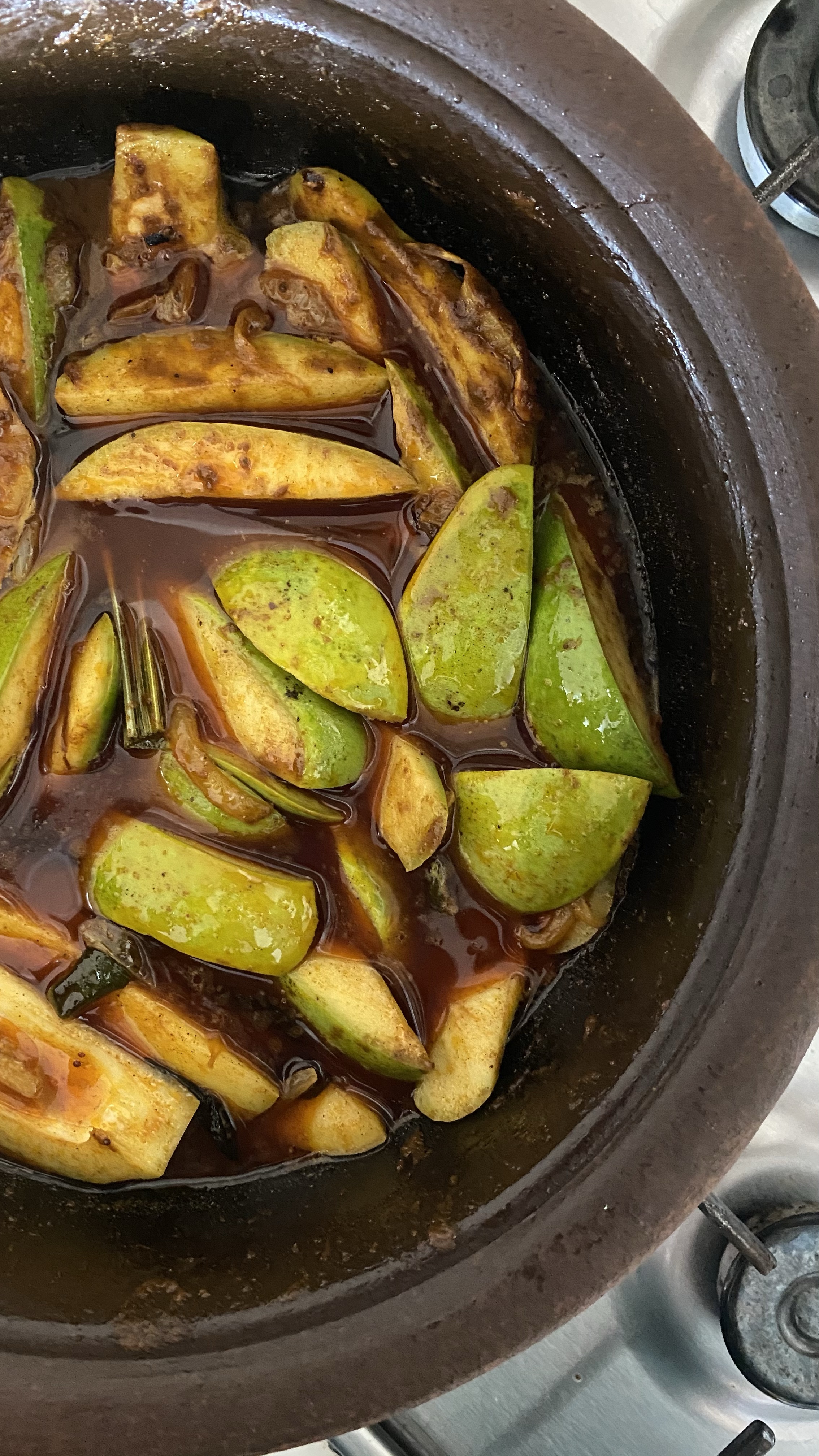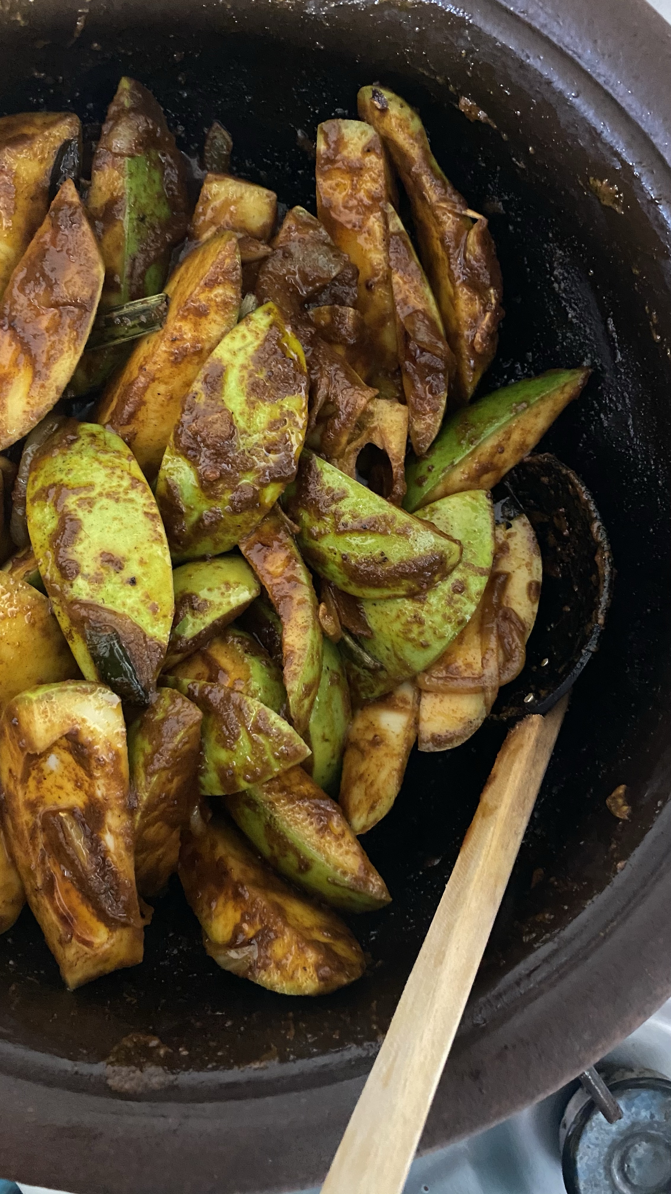 6.now add the marinaded raw mango slices and mix well with aromas and spices. About 1-3 minutes.