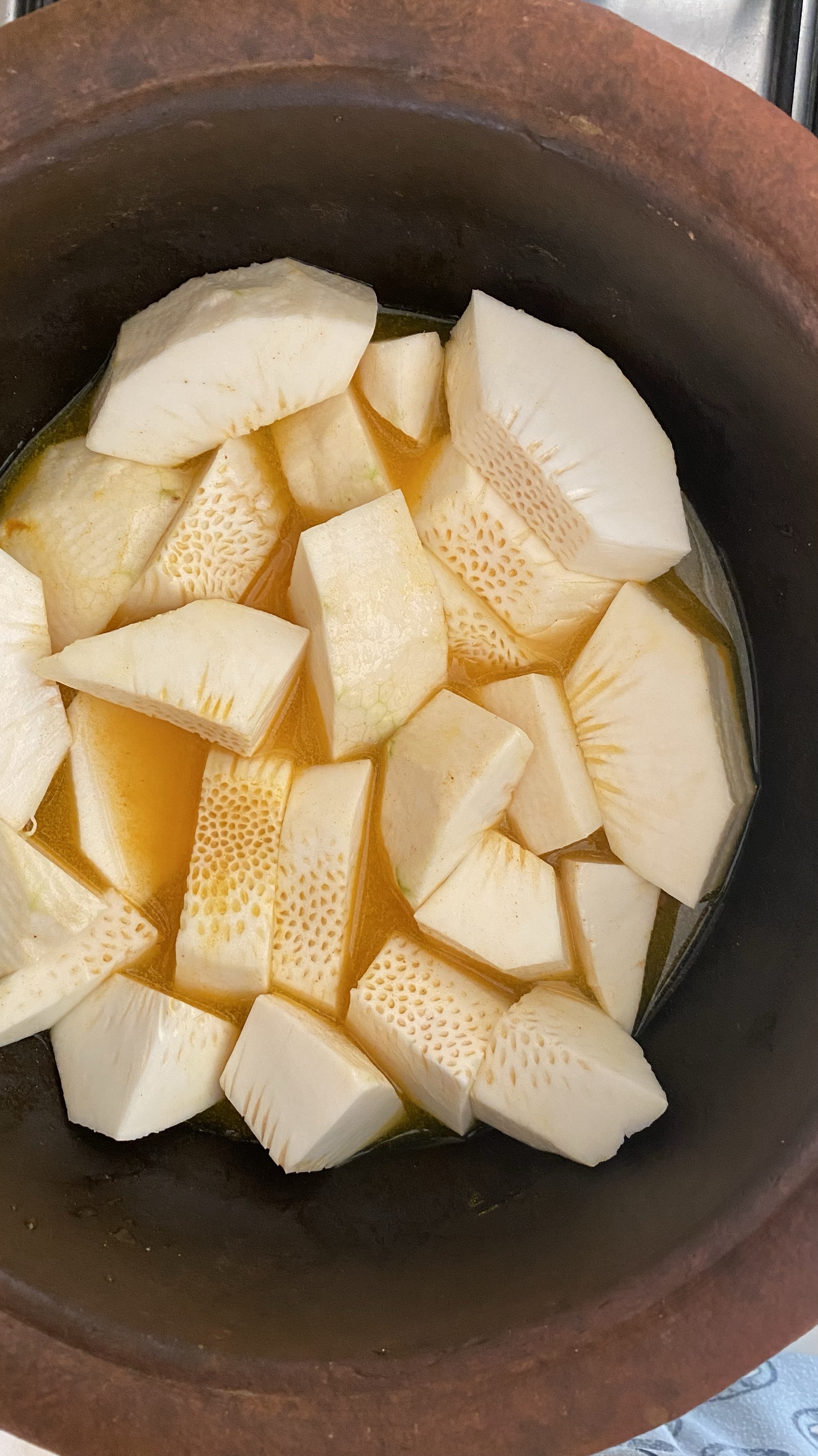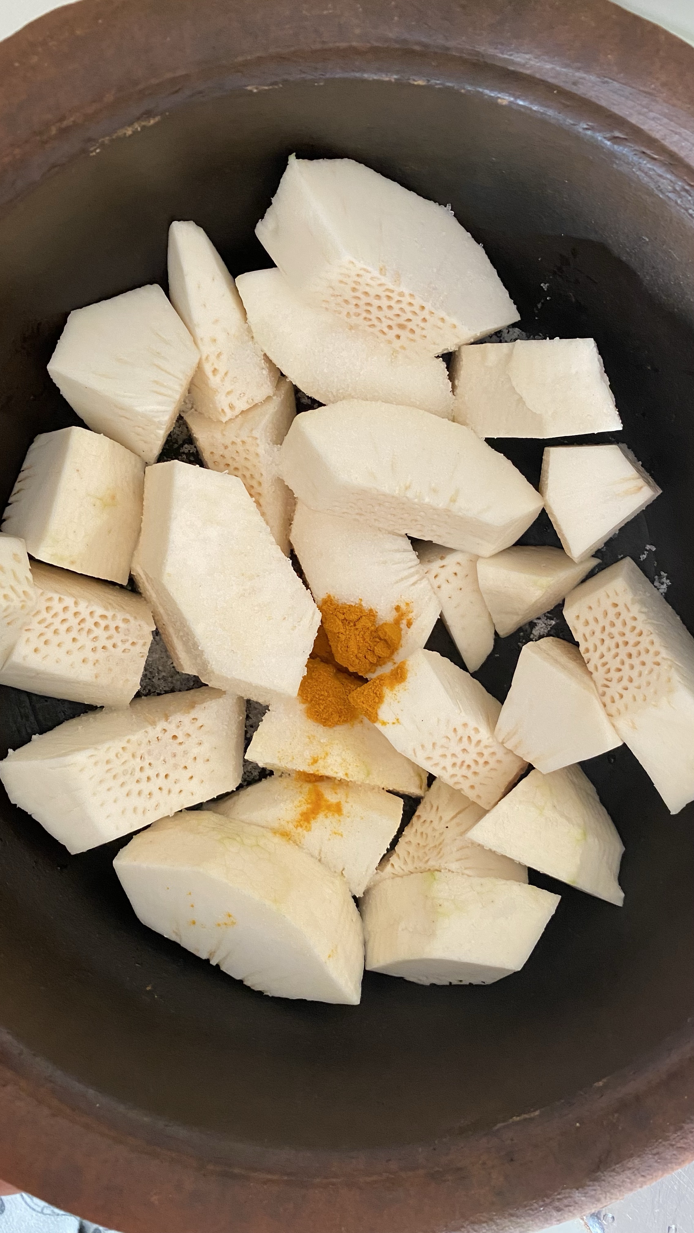 Though I had eaten these million times when I was in SL, never cooked by myself. What my mother told me was “cook just like you cook potatoes” oh..!! How simple it is…. But the main tip she gave me was “just add the enough water to boil and simmer all, do not drain the water used to boil the breadfruit” Ah..!!! How should I know the exact amount then…? Well, firstly I added around 300ml water and seems like not enough so added another 150ml and then boiled the breadfruit until water gets dried. But this may be vary. So keep an eye while boiling your breadfruit.